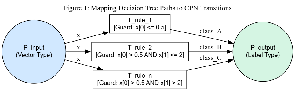 The figure below shows the CPN structure for a Decision Tree module. The input port place \(P_{input}\) (colour type \(\text{VEC}\)) holds the feature vector token \(x\), which is available to all transitions via their input arcs. Each transition \(T\_rule\_i\) has a guard composed of the conjunction of split predicates along its tree path. Since the guards are derived from complementary <= / > splits at every internal node, exactly one transition is enabled for any complete input, consuming \(x\) and depositing the class label in \(P_{output}\).